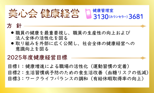 〇美心会の健康経営の取り組みを外部に広く公開し、地域企業の健康経営への意識向上を図ってまいります。