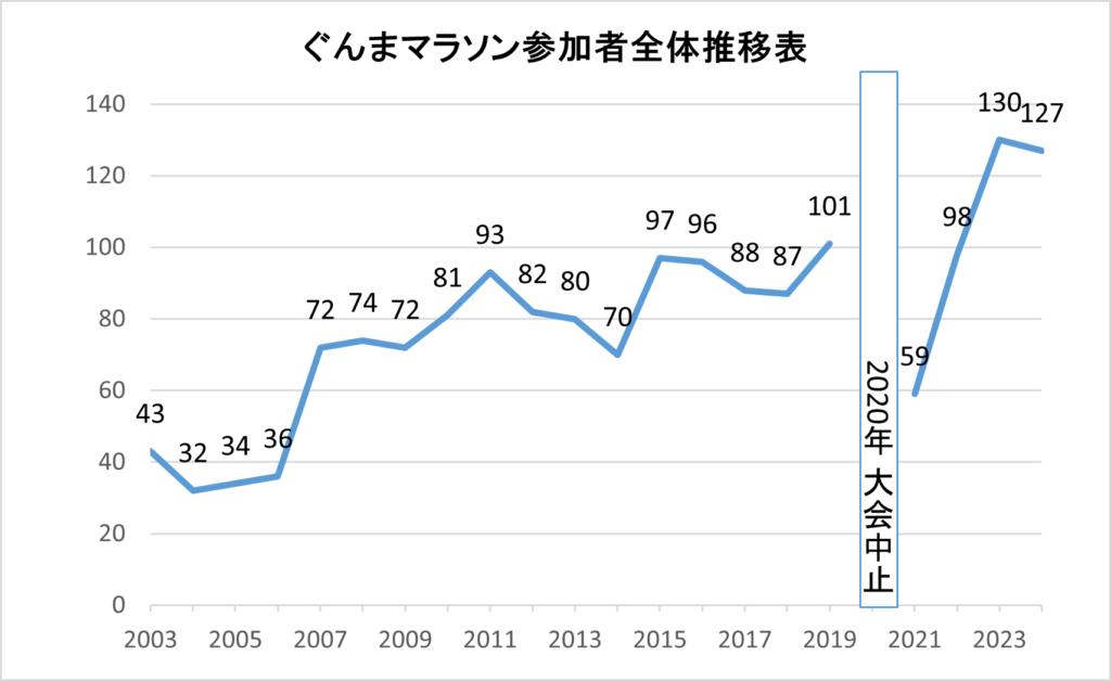 職員の健康維持増進と地域の活性化を目的に2003年から参加を始めた「ぐんまマラソン」の参加者数は開始当時の43名から最高101名までに増加しました。新型コロナ感染拡大のため2020年には大会中止、2021年には規模縮小のため4キロ部門が中止となるなどの影響がありましたが、フルマラソン参加者人数に変化はなく、コロナ禍においても前向きに健康増進に取り組む様子が伺えます。