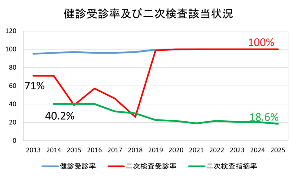 美心会は職員の二次検査の受診率100%を目指し、二次検査該当者0を目標としています。