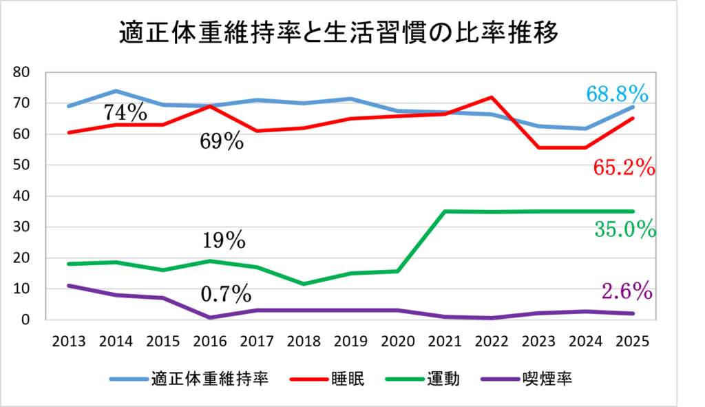 睡眠による十分な休養が取れている比率はわずかに改善傾向にありますが、適正体重維持率はピーク時より7ポイント下がり、依然として低い数値となっています。また、喫煙については禁煙外来への受診推奨を周知し、今後も各項目の数値を改善のためのさらなる施策立案・検討を継続していきます。