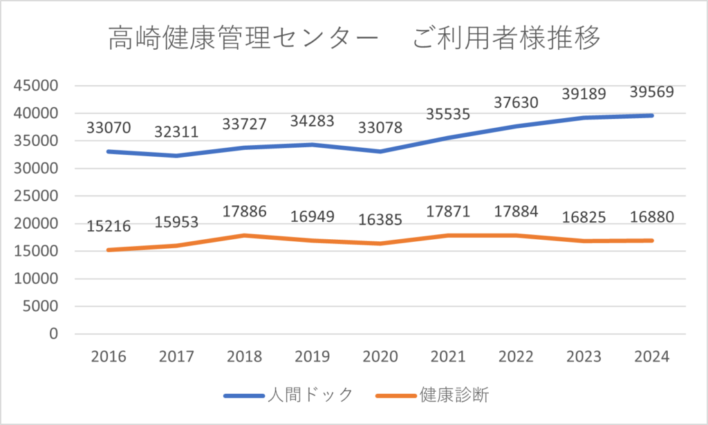 人間ドックの受診者数を2%、健康診断の受診者数を9%上げることを目標に取り組んでいます。2023年度までの年間ご利用者様数推移は下記グラフの通り。人間ドックご利用者様数は2016年度から30,000名を超えており、生産性向上を図りながらご利用者様の増加すなわち収益増加の成果を出しています。 2020年度以降には新型コロナウイルス感染拡大による「受診控え」の影響がありましたが、徹底した感染対策に努めるだけでなく、コロナ禍においても病気の早期発見・適切治療ができるように受診の啓発活動「健康支援教室(講演)」を3月に実施することで、2022年度はコロナ禍以前よりも受診者数が増加しました。